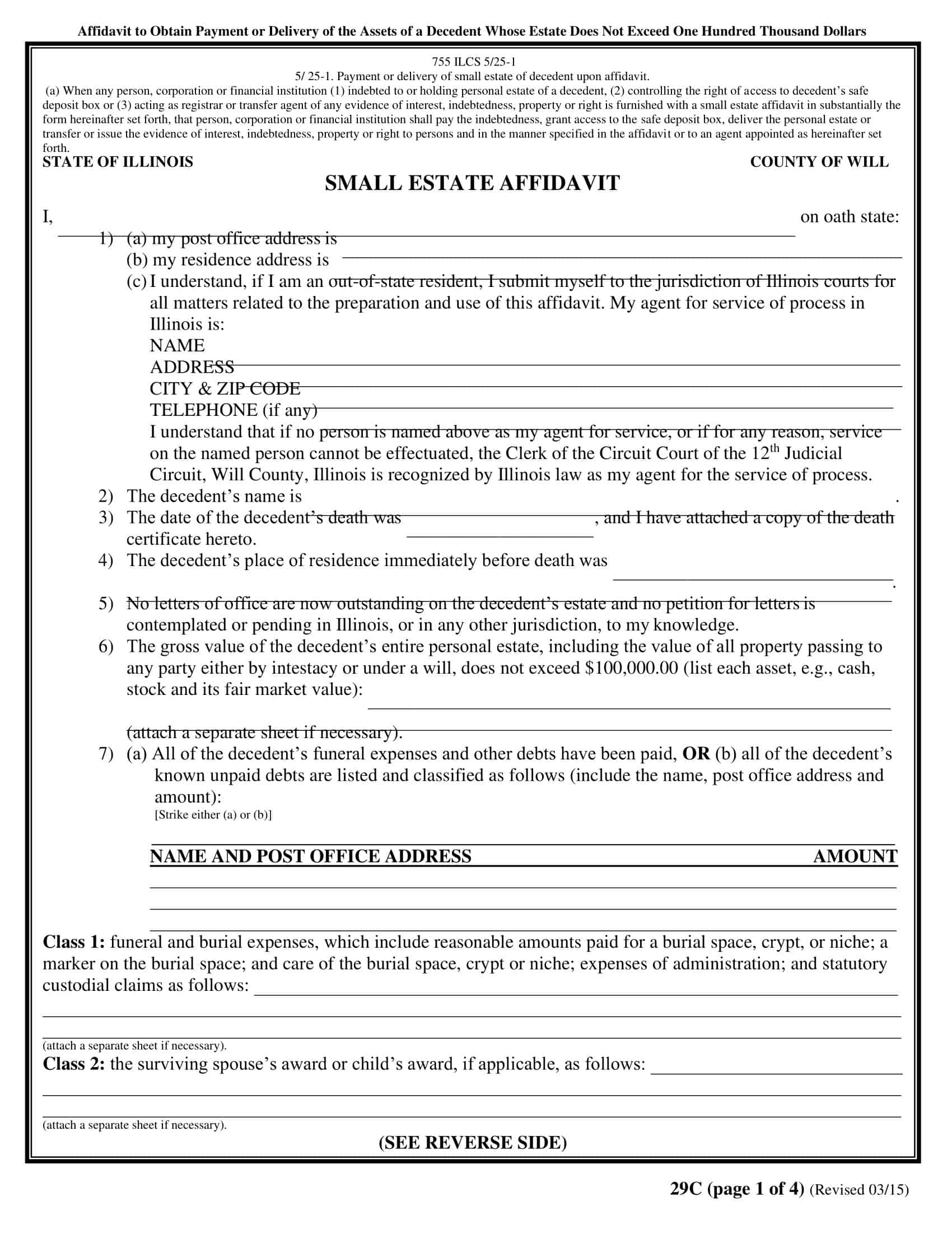 - The complete value of the estate is less than $25,000 ($100,000 if the person filing the Small Estate Affidavit is the deceased individual’s surviving partner)